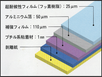 超対候性フィルム(フッ素樹脂)、アルミニウム箔、補強フィルム、ブチル系粘着材の多層構造になっています。
