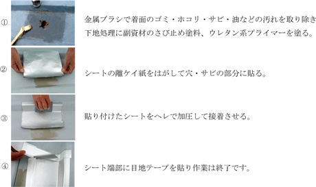 腐食部分の錆を落とした後、錆止め塗料・ウレタン系ブライマーで下地処理を行い、その上からシートを貼ることで錆の進行を抑え、腐食穴を塞ぐことができます。