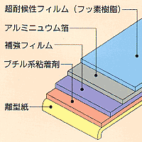 特殊フッ素樹脂フイルムとアルミ箔に補強フイルムをラミネートし、厳しい環境条件にも優れた防水性能を発揮します。屋根屋上・地下室の防水・室内プールの天井・水槽の側面の防水に向いているニュータイプの金属防水材です。