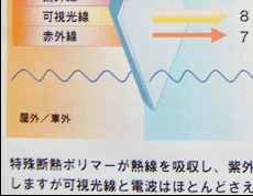 近赤外線を75%カットします。室内温度の上昇、肌を刺激する強い日差しを特殊な断熱ポリマーが熱線を吸収して波長域を遮断します。